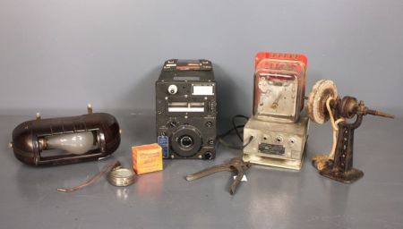 Group of Eight Miscellaneous Items; volt reader, electric lamp, transmitter, T-18/ARC-5 28 Volts DC, star scruin lead anchors, interphone amplifier Group of Eight Miscellaneous Items; volt reader, electric lamp, transmitter, T-18/ARC-5 28 Volts DC, star scruin lead anchors, interphone amplifier