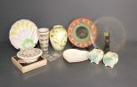 Assortment of Decorative Glass, group includes; serving plates, two vases, musical Happy Birthday cake plate holder, two candle holders and two heart shaped plates Assortment of Decorative Glass, group includes; serving plates, two vases, musical Happy Birthday cake plate holder, two candle holders and two heart shaped plates