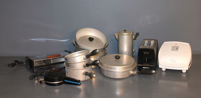 Group of Miscellaneous Cooking Items; pots and pans, bread maker, toaster and George Forman Grill, no items have been tested Group of Miscellaneous Cooking Items; pots and pans, bread maker, toaster and George Forman Grill, no items have been tested