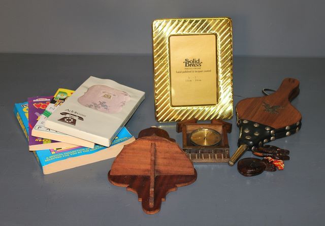 Group of Miscellaneous items, group includes; four books, solid brass frame, small wall clock, picture hanger, clappers and fire blower Group of Miscellaneous items, group includes; four books, solid brass frame, small wall clock, picture hanger, clappers and fire blower