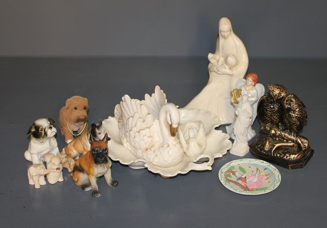 Group of Decorative Items, group includes; porcelain duck on plate, dog figurines, angel figurines, angel plate and owl figurine Group of Decorative Items, group includes; porcelain duck on plate, dog figurines, angel figurines, angel plate and owl figurine