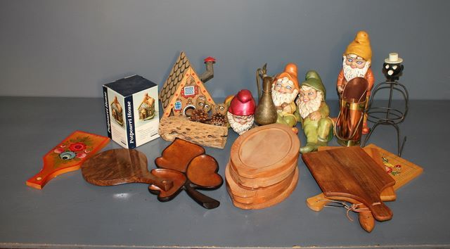 Group of Miscellaneous Items; lawn gnomes, two bird houses, plate holders, various chipping blocks and two pine cone owls sitting on a log Group of Miscellaneous Items; lawn gnomes, two bird houses, plate holders, various chipping blocks and two pine cone owls sitting on a log
