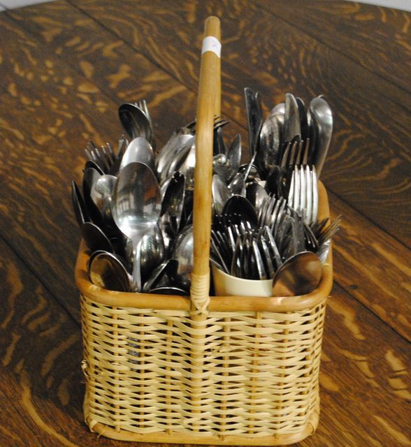 Divided Wicker Basket with Large Group of Silverware Divided Wicker Basket with Large Group of Silverware