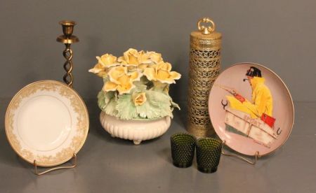 Noritake Bowl, 7"dia. Porcelain Flower Bowl, 9"h. Norman Rockwell Series Plate, 9"dia. Brass Candle Cover, 11"h. Spiral Candle Holder, 11"h. Two Green Dotted Cups, 3"h Noritake Bowl, 7"dia. Porcelain Flower Bowl, 9"h. Norman Rockwell Series Plate, 9"dia. Brass Candle Cover, 11"h. Spiral Candle Holder, 11"h. Two Green Dotted Cups, 3"h