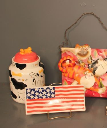 Ceramic Dog Treat Canister decorated with Dogs and Dog Bones, Tin Hanging Basket with Whimsical Cats on Front and a Small American Flag Ceramic Tray. Canister 9 1/2"h Basket 10"w 8 1/2"h Tray 9 1/2"w 4 1/2"h. Ceramic Dog Treat Canister decorated with Dogs and Dog Bones, Tin Hanging Basket with Whimsical Cats on Front and a Small American Flag Ceramic Tray. Canister 9 1/2"h Basket 10"w 8 1/2"h Tray 9 1/2"w 4 1/2"h.