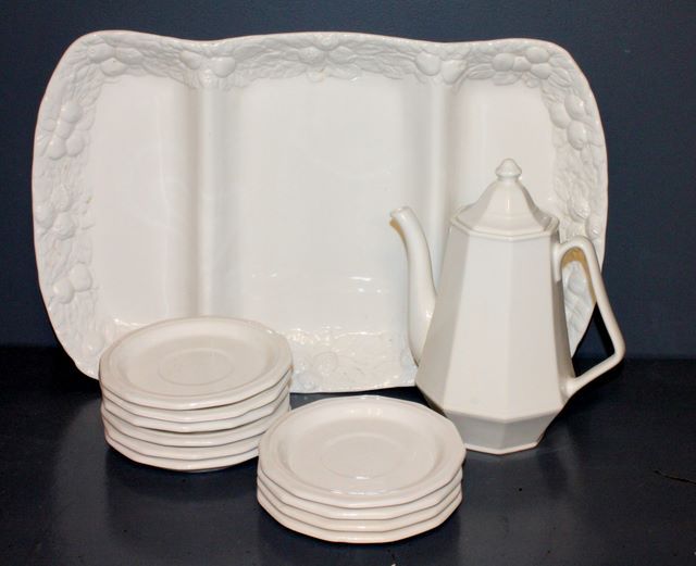 White Bloomingdale Three Section Divided Tray with Fruit design Border, marked made in Italy on back, White Coffee Pot with Lid and Ten White Saucers. Tray 20 1/2"w 12 1/2"h Coffee Pot 9 1/2"h Saucers 6 1/2"dia. White Bloomingdale Three Section Divided Tray with Fruit design Border, marked made in Italy on back, White Coffee Pot with Lid and Ten White Saucers. Tray 20 1/2"w 12 1/2"h Coffee Pot 9 1/2"h Saucers 6 1/2"dia.
