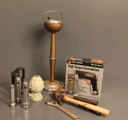 Black and Decker High Torque Screwdriver, Five Flashlights, Four Hammers, Wrench, pineapple Shape Water Sprinkler and a Vintage Stand Ashtray, Black and Decker High Torque Screwdriver, Five Flashlights, Four Hammers, Wrench, pineapple Shape Water Sprinkler and a Vintage Stand Ashtray,