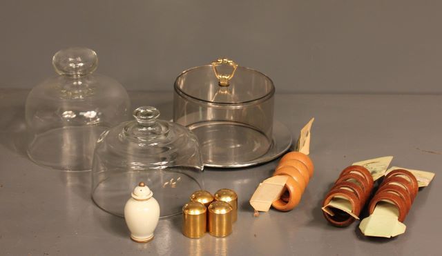 Pair of Glass Cheese Domes along with an Aluminum Cheese Plate with Plastic Dome, Twelve Wooden Napkin Rings, Four Small Gold Salt and Peppers and an Ivory Color Salt with Gold Trim. Cheese Domes 6 1/2"dia. Pair of Glass Cheese Domes along with an Aluminum Cheese Plate with Plastic Dome, Twelve Wooden Napkin Rings, Four Small Gold Salt and Peppers and an Ivory Color Salt with Gold Trim. Cheese Domes 6 1/2"dia.