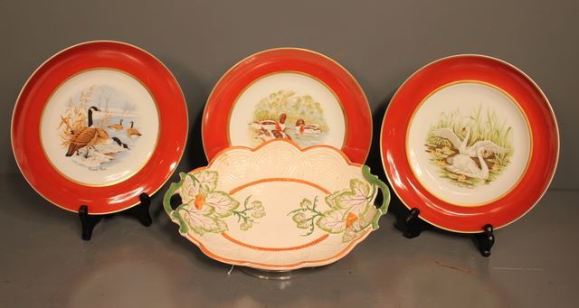 Two-Handled Vegetable Tray marked made in Italy on back and three D decorative Plates with Rust color bands and Images of Waterfowl in Center. Stamped Portugal on Back. Tray 12"w 9"h Plates 9 3/4"diam Two-Handled Vegetable Tray marked made in Italy on back and three D decorative Plates with Rust color bands and Images of Waterfowl in Center. Stamped Portugal on Back. Tray 12"w 9"h Plates 9 3/4"diam