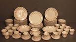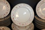 Large Set of Abingdon Fine Porcelain China with white background and border of flowers and silver rim. Set includes 28 plates, 28 saucers, 30 cups, gravy boat, oval vegetable bowl and round vegetable bowl. Large Set of Abingdon Fine Porcelain China with white background and border of flowers and silver rim. Set includes 28 plates, 28 saucers, 30 cups, gravy boat, oval vegetable bowl and round vegetable bowl.