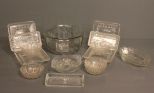 Group of Clear Glass Items including a Large Bowl with scalloped edge rim, four Snack Plates, Seven Pressed Glass Berry Bowls, Three Starburst Pattern Rectangular Trays, Two Oval Condiment Bowls and a large Juicer. Large Bowl 10"w 4"h, Berry Bowls 4 1/2"dia., Starburst Trays 3 1/2"w 7"l, Snack Plates 6 1/2"square, Oval Bowls 7"l, Juicer 6" dia. Group of Clear Glass Items including a Large Bowl with scalloped edge rim, four Snack Plates, Seven Pressed Glass Berry Bowls, Three Starburst Pattern Rectangular Trays, Two Oval Condiment Bowls and a large Juicer. Large Bowl 10"w 4"h, Berry Bowls 4 1/2"dia., Starburst Trays 3 1/2"w 7"l, Snack Plates 6 1/2"square, Oval Bowls 7"l, Juicer 6" dia.
