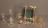 Three Crystal Candlesticks and a Silverplate framed Mirror along with a pair of Crystal Horsehead Book Ends, a small silver tone candlestick and a clear glass round flower vase. Crystal candlesticks 8"h, 6"h, 4"h Framed Mirror 8"w 10 1/2"h. Three Crystal Candlesticks and a Silverplate framed Mirror along with a pair of Crystal Horsehead Book Ends, a small silver tone candlestick and a clear glass round flower vase. Crystal candlesticks 8"h, 6"h, 4"h Framed Mirror 8"w 10 1/2"h.