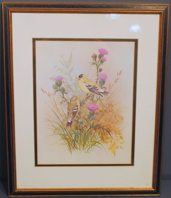 Framed print of a Pair of Yellow Finch Birds perched on a flower branch. 17 1/2"w 21 1/2"h. Framed print of a Pair of Yellow Finch Birds perched on a flower branch. 17 1/2"w 21 1/2"h.