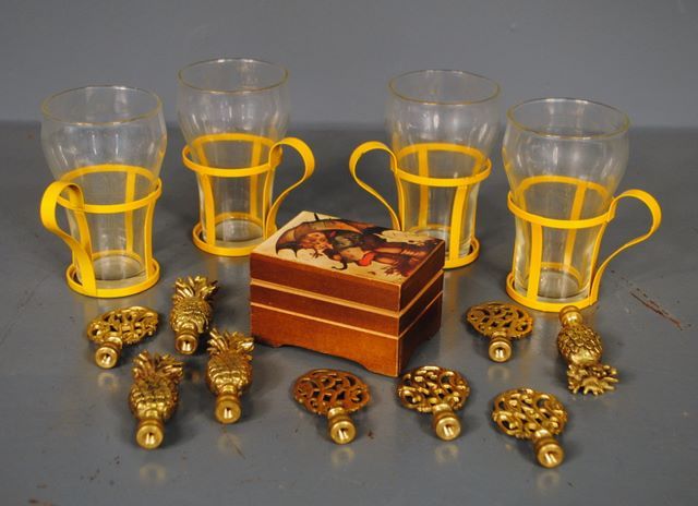 4 Glasses, Music box, Decorative Brass Lamp Finials. 4 Glasses, Music box, Decorative Brass Lamp Finials.
