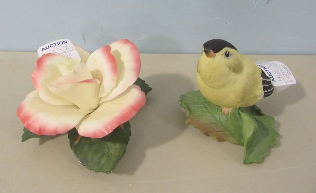 The goldfinch has a small chip to the beak and is number 40167. The double rose has a repaired petal and is number F-165. The goldfinch has a small chip to the beak and is number 40167. The double rose has a repaired petal and is number F-165.