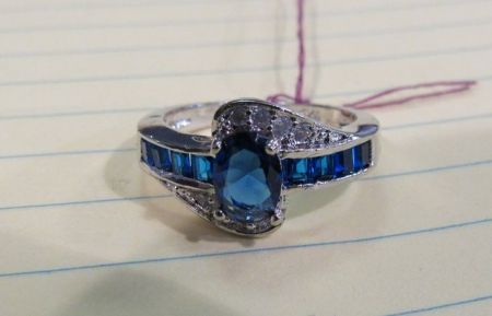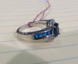 626 Silvertone Ring with Oval Blue Stone and Channel Set Blue Stones Accented with Clear Stone Accents