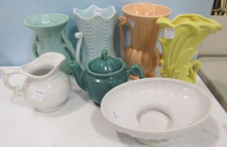 Includes McCoy peach vase 9"h, McCoy turquoise vase, yellow McCoy swan vase, USA 219-9, green USA teapot (chip), McCoy 7528, Floraline oval bowl (hairline cracks). Includes McCoy peach vase 9"h, McCoy turquoise vase, yellow McCoy swan vase, USA 219-9, green USA teapot (chip), McCoy 7528, Floraline oval bowl (hairline cracks).