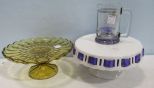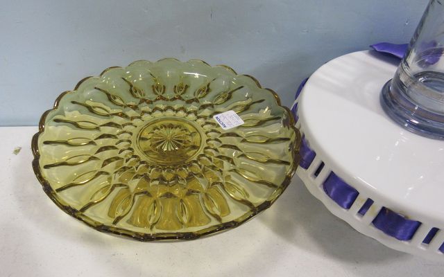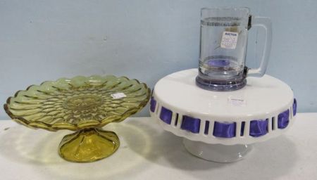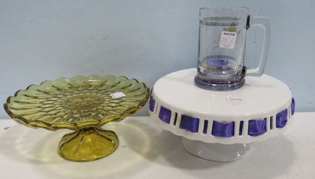 715 A 10" Amber Cake Stand, a Ribbon Border White Cake Stand and a Glass Stein