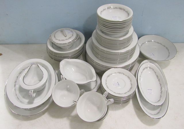 Includes: eight dinner plates, nine salad plates, eight bread and butter plates, eight berry bowls, seven cereal bowls, seven cups and saucers, one saucer, six serving pieces and a cream and sugar bowl. There may be chips. Includes: eight dinner plates, nine salad plates, eight bread and butter plates, eight berry bowls, seven cereal bowls, seven cups and saucers, one saucer, six serving pieces and a cream and sugar bowl. There may be chips.