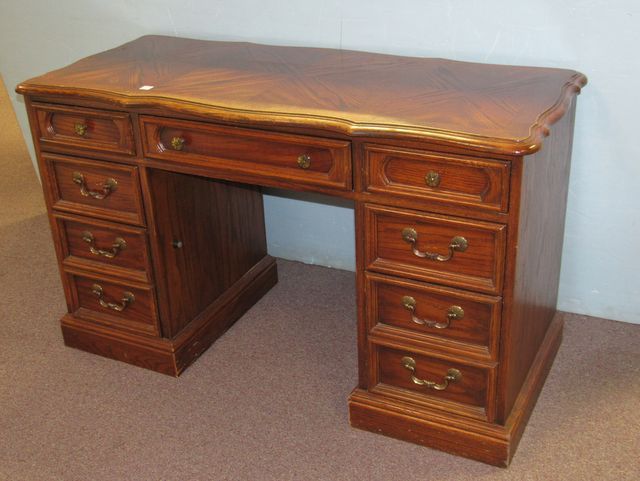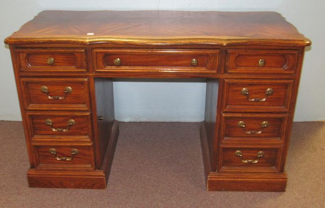There is some wear to the finish and there is no key. Measures 50" w x 22" d x 30" h. There is some wear to the finish and there is no key. Measures 50" w x 22" d x 30" h.