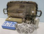 900 Rectangular Silverplate Tray with Handles, Wedgwood Henley Silverplate Napkin Rings, Pewter Shell, Pewter Stein, National Stainless Flatware and a Wild Bill's Cup