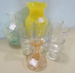 Includes eight juice glasses, short pink dolphin candlestick, 4 1/2" h, a yellow vase and a swirl art glass vase. Includes eight juice glasses, short pink dolphin candlestick, 4 1/2" h, a yellow vase and a swirl art glass vase.