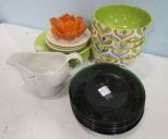 1106 Four Lime Green Ceramic Plates, with Colored Pattern Bowls, Four Small Beaded Edge Plates, An Orange Pottery Votive Holder,Six Green Glass Plates and a Black Glass Plate