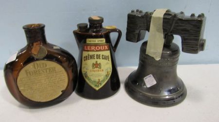1107 Old Forester Bottle, Leroux Creme de Cafe Bottle and a Michter's Liberty Bell 1976 Decanter