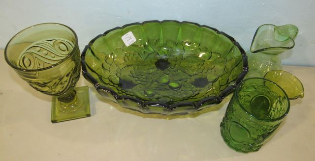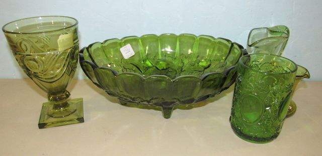 1203 L E Smith Fruit Bowl, Pair of Green Glass Pitchers, and Two Vintage Green Glass Vases