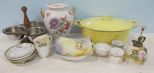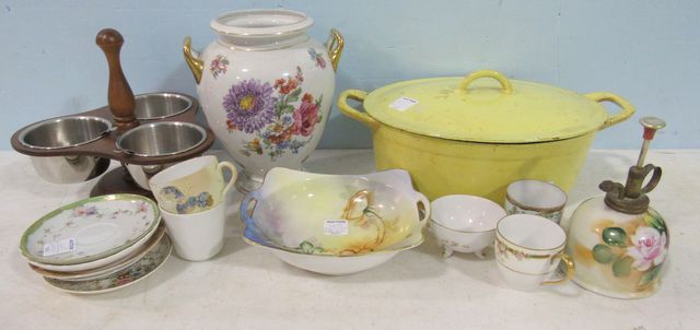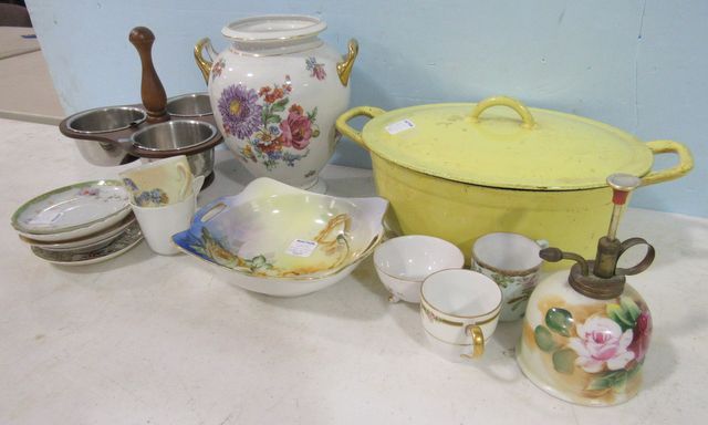 1215 Group Lot of Demitasse Cups, Miscellaneous Saucers, Plant Mister, Nippon Bowl, Jar without Lid, Wood and Stainless Condiment Server and a Descoware Enamel Dish