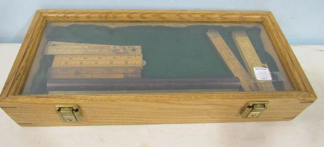 348 Group of Vintage Folding Rulers in a Display Cabinet