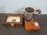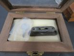658 Old Wooden Winchester 22 Kit Box, Wilton Pewter Mug with Gun Hilt Handle, and a 1890's Millers Falls Co Spirit Level in Box with Key