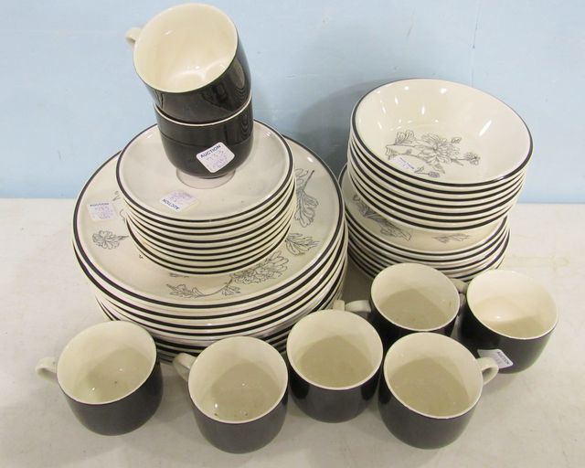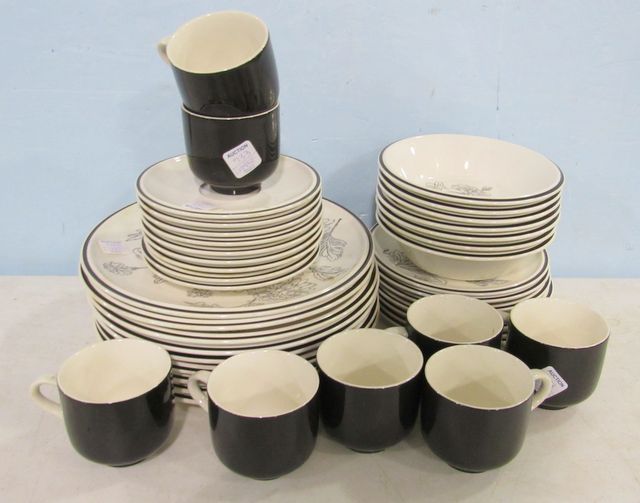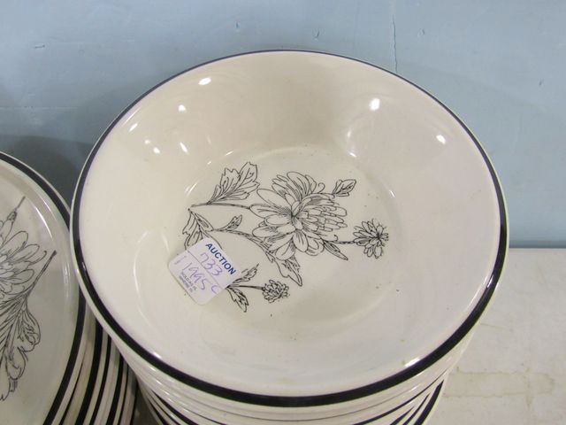 Includes nine dinner plates, seven salad plates, nine saucers, and eight cups. May have chips. Includes nine dinner plates, seven salad plates, nine saucers, and eight cups. May have chips.