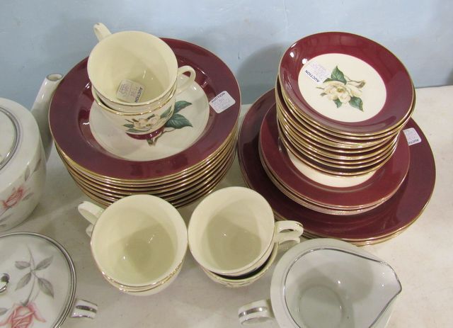 734 Homer Laughlin Burgundy China Set and a Noritake Rosemarie Teapot, Creamer and Sugar Bowl