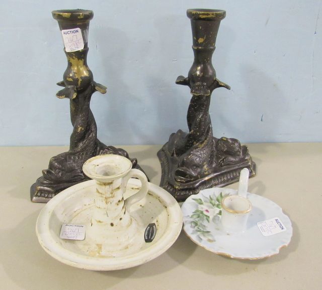 767 Pair of Dolphin Metal Candlesticks, a Pottestuen Frederikshavn Pottery Chamberstick and a Handpainted Chamberstick