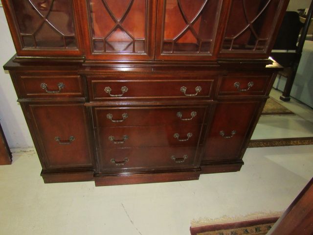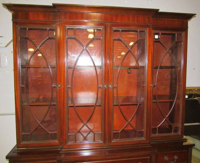 533 Mahogany Breakfront with Four Upper Glass Doors, Six Drawers and Two Lower Cabinet Doors and a Drop Down Desk