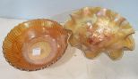 698 Marigold Carnival Glass Cherry Ruffled Edge Footed Bowl and a Marigold Pressed Glass Bowl