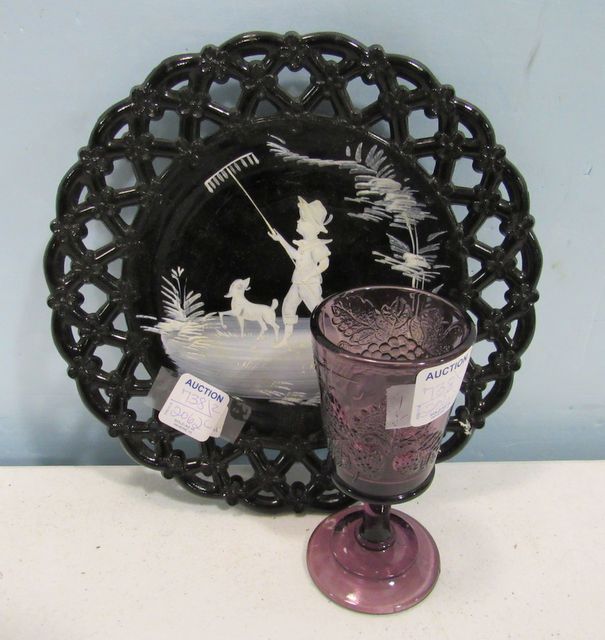 738 Mary Gregory Style Black Glass Plate and a Pressed Glass Amethyst Stem