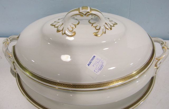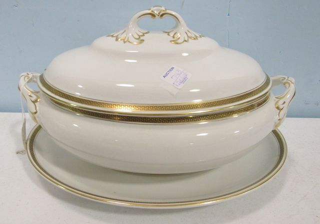 743 Large Keeling Losol Wear Tureen with Underplate and Gold Greek Key Design