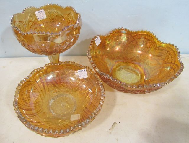 Includes an Imperial glass compote, Imperial glass bowl and a 10" diameter bowl. Includes an Imperial glass compote, Imperial glass bowl and a 10" diameter bowl.
