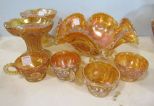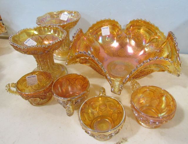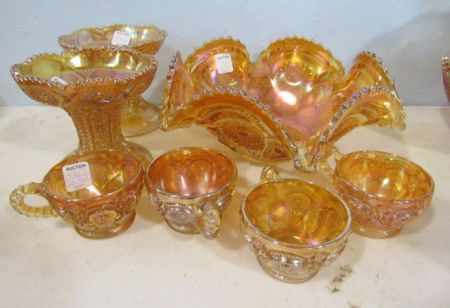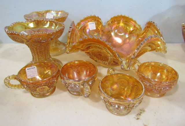 436 Ruffled Edge Carnival Glass Marigold Bowl, Four Punch Cups and Two Punch Bowl Bases
