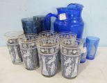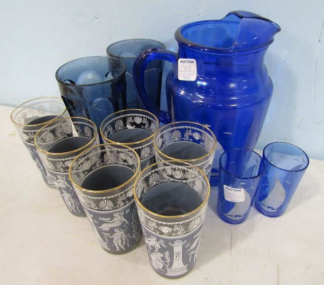 748 Two Jamestown Blue Iced Tea Glasses, Blue Hazel Atlas Sail Boat Pitcher with Two Matching Glasses and Six Decorative Glasses