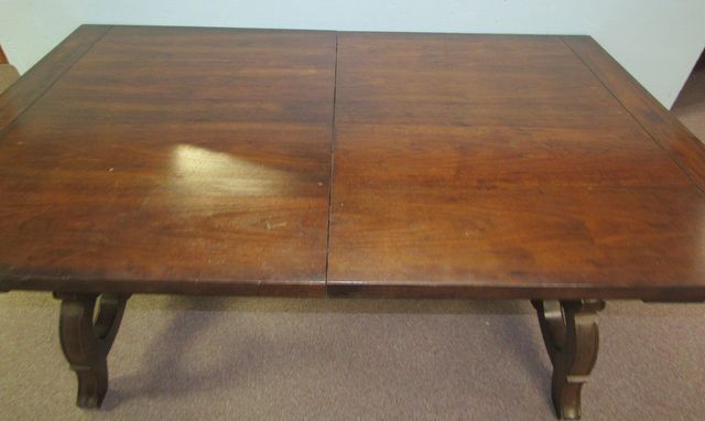 Measures 42" w x 66" d 30" h. Has one leaf that measures 18" w. Measures 42" w x 66" d 30" h. Has one leaf that measures 18" w.