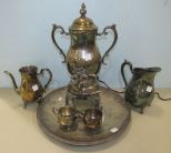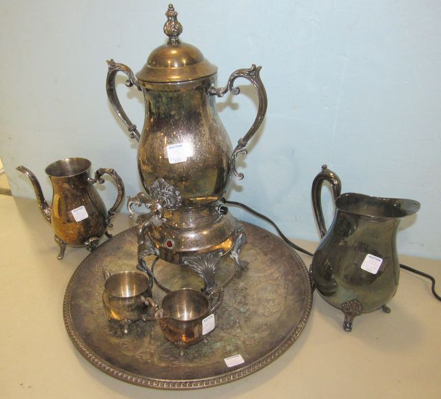 905 Large Silverplate Tray, an Electric Coffee Urn, a Coffee Pot without Lid, Creamer, Sugar Bowl, and a Water Pitcher