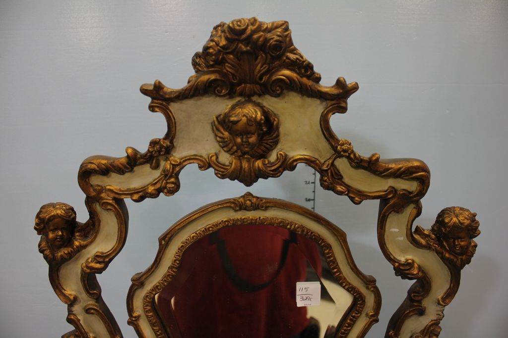 French Style Vintage Dressing Mirror (table top) with cupids, paw feet, gilt. 16 1/2"w, 29"h. French Style Vintage Dressing Mirror (table top) with cupids, paw feet, gilt. 16 1/2"w, 29"h.