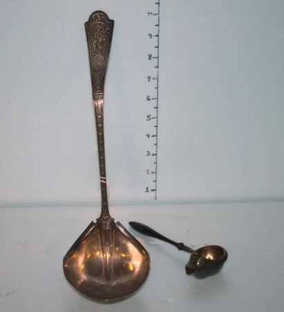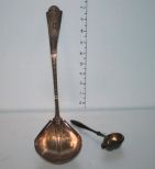 Ornate Engraved Winged Cupid Punch Sterling Ladle (by Albert Coles, N.Y. 1835-1875), a Beautiful Etched Bowl with Ornate Handle (12" h., 9 1/2" dia.), and a Small Sheffield Strainer (5 1/2" l.) Ornate Engraved Winged Cupid Punch Sterling Ladle (by Albert Coles, N.Y. 1835-1875), a Beautiful Etched Bowl with Ornate Handle (12" h., 9 1/2" dia.), and a Small Sheffield Strainer (5 1/2" l.)
