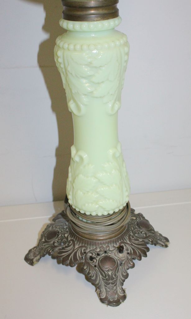 Royal Green Milk Glass Victorian Banquet Lamp. Beautiful leaf and foliage design, signed on base P & A (Plume and Atwood) circa 1880, electrified Royal Green Milk Glass Victorian Banquet Lamp. Beautiful leaf and foliage design, signed on base P & A (Plume and Atwood) circa 1880, electrified