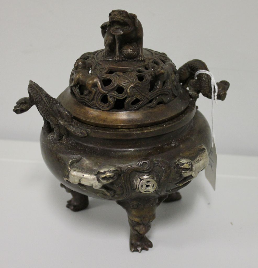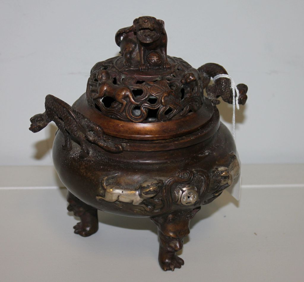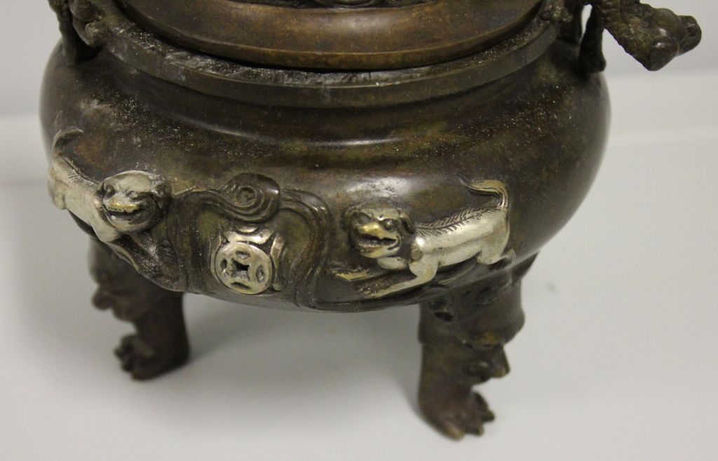 Japanese Bronze Incense Burner with Foo Dog Lid, dragon handles, silver decorated foo dogs on sides, mark on bottom; 7" h., 6 1/2" dia. Japanese Bronze Incense Burner with Foo Dog Lid, dragon handles, silver decorated foo dogs on sides, mark on bottom; 7" h., 6 1/2" dia.