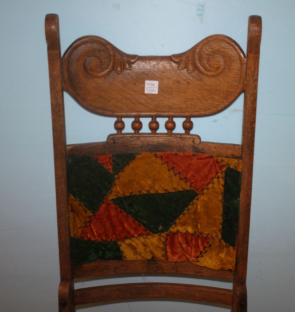 Oak Wood Chair with Patchwork Upholstery; 42 1/2" h., 18" w., 16" d. Oak Wood Chair with Patchwork Upholstery; 42 1/2" h., 18" w., 16" d.