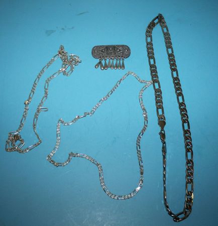 Two .925 Italian Made Necklaces, a Made in Mexico Pin, and a .925 Necklace (11 1/2" l.) Two .925 Italian Made Necklaces, a Made in Mexico Pin, and a .925 Necklace (11 1/2" l.)